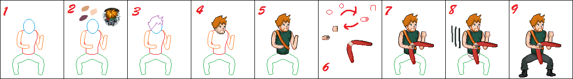 6. The hands are always tricky, and if you can see, those are two right hands. I just start with a proportionate circle, shape it out, then color it. The boomerang is his primary weapon, it was basically two curved lines with smaller curved lines to connect them.
